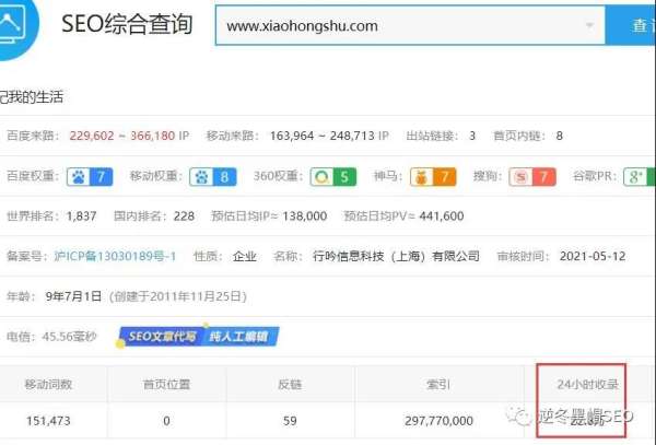 这是小红书1天内的收录,以及截图!大家从爱站数据可以看到、小红书一天收录量22.4w,周级过100w,这个数据是多少人梦寐以求都求不来的。