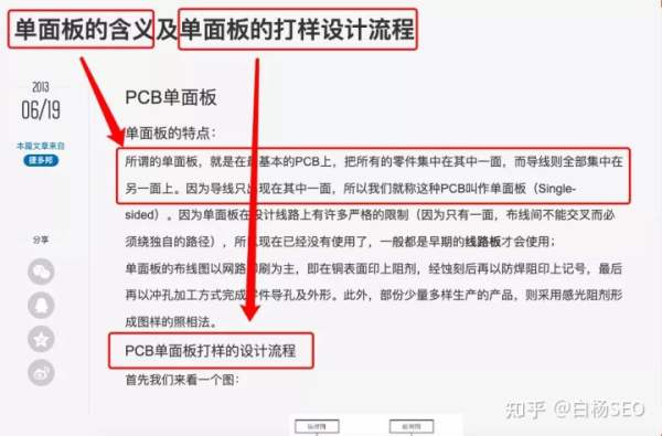 怎么做呢?你可以用白杨SEO公众号写文章这种大纲小标题的方式去配合文章的双标题。我们举例PCB案例哈。如下图,网站内容与标题相对应。