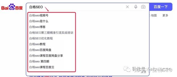 百度下拉词,准确说法是百度搜索框搜索关键词下拉出相关关键词。官方叫百度推荐词。比如搜索"白杨SEO",百度搜索下拉如图: