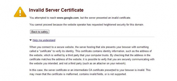 ⑤.如果网站使用自签名CA进行保护,或者Google Chrome无法识别该CA,则它将显示无效服务器证书错误。确保使用真实可信的SSL证书颁发机构来保护您的网站。