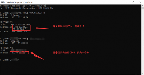 查看ping出来的结果,如果IP是一个地址,那么此网站没有配置CDN加速,如果有两个那么此网站配置CDN加速。
