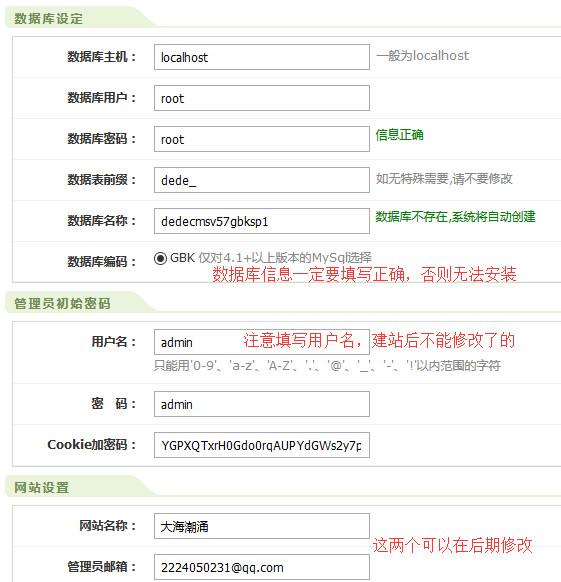 (注意:数据库信息一定要填写正确,否则无法安装;管理员的用户名要想好,建站后不能修改了的,除非你重新建站)