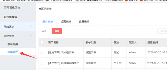 表单管理:网站上每个版块要实现可视化编辑,必须把根据内容先设计表单才能可视化编辑,系统默认添加了一些常用的表单,如下图: