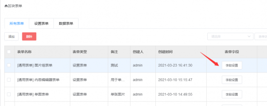 一些复杂的内容场景可以点击"添加"按钮来自定义设计表单,添加表单后点击字段设置进去字段管理界面,进行字段的添加,如下图: