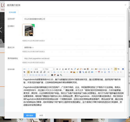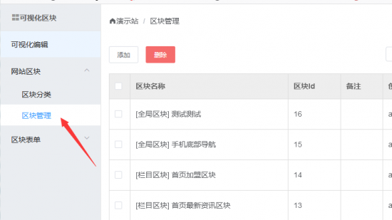 区块管理:页面上的自定义版块如果需要进行可视化编辑,就需要通过区块来实现,自定义版块和区块数据一一对应,区块的添加和管理如下: