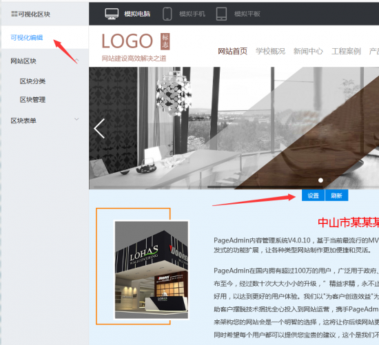 PageAdmin要实现可视化编辑,需要借助可视化区块来实现,下面讲解一下可视化区块的使用教程,首先进入可视化编辑菜单,如下图: